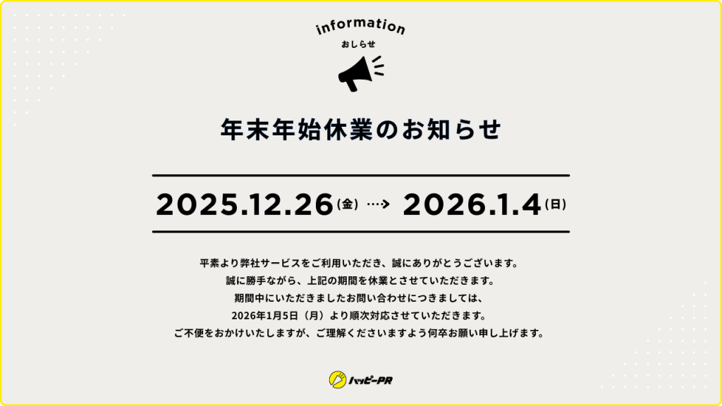 年末年始の休業期間:2025年12月26日(金)~2026年1月4日(日)